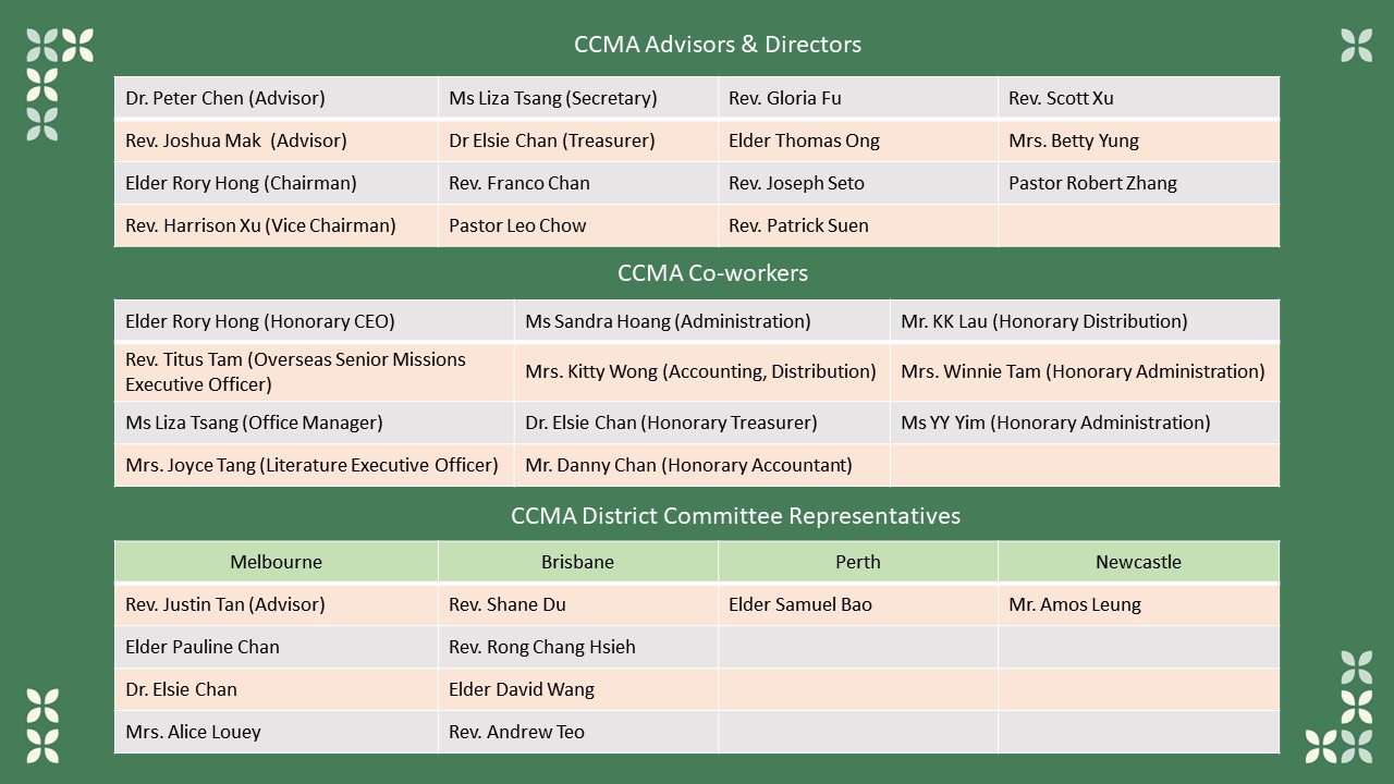 Our main ministry initially was to distribute the monthly magazine, Chinese Today, and sending out short term mission teams. By the grace of God, CCMA progressed over the past years to become a diversified entity providing various services to Chinese churches in Australia and New Zealand.